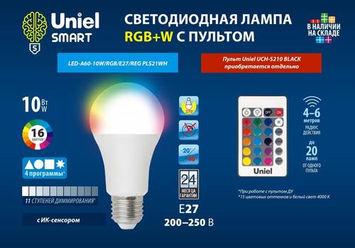 Лампа LED с ИК сенсором. Форма 'А', RGB свет. Пуль отдельно, Uniel LED-A60-10W-RGB-E27-REG PLS21WH